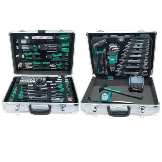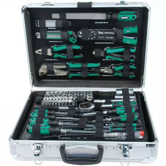 – Dieses 106-teiliges Werkzeug-Set von Brüder Mannesmann, das aus ergonomisch geformten Handwerkzeugen in verschiedenen Größen besteht, ist für eine breite Palette von Bau- und Reparaturarbeiten rund um Haus, Werkstatt oder Garage geeignet. – Es ist ideal für Profis und Hobbyhandwerker gleichermaßen. – Das aus professionell wärmebehandeltem Chrom-Vanadium-Stahl gefertigte Set ist sehr stark und langlebig. – Die Werkzeuge sind leicht zu transportieren und nehmen in ihrem Tragekoffer nicht zu viel Lagerraum ein. – Lieferung umfasst 106 Werkzeuge (eine Zange, zwei Kombizangen, zwei Seitenschneider, zwei Nadelzangen, eine Crimpzange, ein Mehrzweckmesser, Ersatzklingen, eine Feile, eine Bügelsäge, Ersatzsägeblätter, Schraubendreher, Präzisions-Schraubendreher, ein Spannungsprüfer, ein Schlosserhammer, ein Maßband, Gabelschlüssel, Sechskantschlüssel, ein Ratschen-Steckschlüssel, ein Multi-Bit-Schraubendreher, Erweiterungen, Bitadapter, Bits, ein Schnellwechsel-Bit-Adapter).