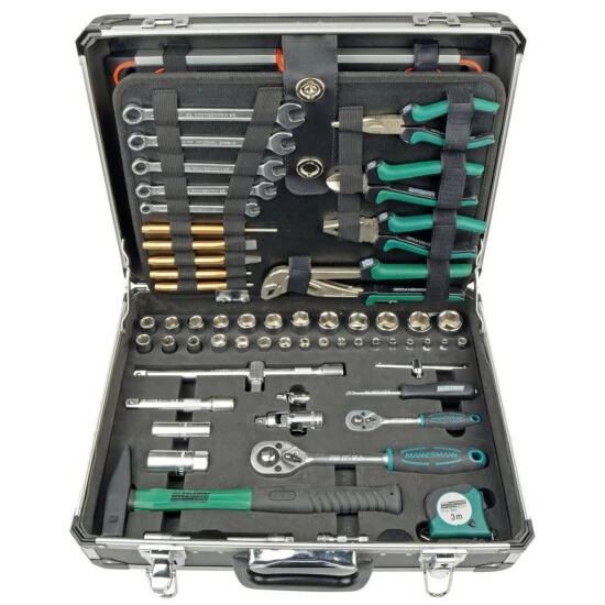 – Dieses 86-teiliges Werkzeug-Set von Brüder Mannesmann, das aus ergonomisch geformten Handwerkzeugen in verschiedenen Größen besteht, ist für eine große Vielfalt von Bau- und Reparaturarbeiten rund um das Haus, Werkstatt oder Garage geeignet. – Es ist für Profis und Hobbywerker gleichermaßen geeignet. – Das aus professionell wärmebehandeltem Chrom-Vanadium-Stahl gefertigte Set ist sehr stark und langlebig. – Die Werkzeuge sind leicht zu transportieren und nehmen in ihrem Tragekoffer nicht zu viel Lagerraum ein. – Die Lieferung umfasst 160 Werkzeuge (eine Zange, zwei Kombizangen, zwei Seitenschneider, zwei Nadelzangen, ein Maulschlüssel, ein Schlosserhammer, ein Maßband, ein Meißel, ein Stechbeitel, eine Stanze, ein Körner, ein Splinttreiber, Schraubendreher, Präzisions-Schraubendreher, ein Spannungsprüfer, ein Multi-Bit-Schraubendreher, Bits, ein Schnellwechseladapter, eine magnetische Torpedo Wasserwaage, eine Bügelsäge, Ersatzsägenblätter, ein Mehrzweckmesser , Ersatzklingen, zwei Mehrzweck-Werkstattscheren, Sechskantschlüssel, Ratschen-Steckschlüssel, Verlängerungen, eine gleitende Verlängerung, Kreuzgelenge, eine flexible Erweiterung, eine gleitende T-Stange, Zündkerzensteckerbits).