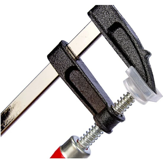 Um Druckstellen auf den Werkstücken zu vermeiden ist diese Schraubzwinge mit Kunststoffschutzbacken ausgestattet