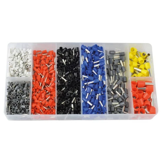 - 1200 x Aderendhülsen in verschiedenen Farben und in verschiedenen Größen (200 x E0508 weiß 0.5 mm², 200 x E7508 grau 0.75 mm², 200 x E1008 rot 1.0 mm², 250 x E1508 schwarz 1.5 mm², 250 x E2508 blau 2.5 mm², 50 x E4009 grau 4.0 mm², 25 x E6012 gelb 6.0 mm², 25 x E10-12 rot 10 mm²)