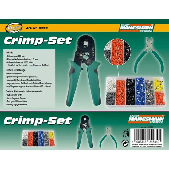 Dieses Crimpzangen-Set von Brüder Mannesmann ist ein handliches Werkzeug-Set zum mühelosen Crimpen, Abisolieren und Schneiden von Kabeln. Die Zange wurde speziell für isolierte Kabelschuhe entwickelt und kann daher Drähte und isolierte Kabel in einem Arbeitsgang crimpen. Dieses Zangen-Set verfügt auch über einen Seitenschneider mit einem rutschfesten Griff. Außerdem enthält das Set ca. 1200 Kabelhülsen (Artikel wird sortiert geliefert. Eine Vorauswahl von Farbe/Muster/Modell ist bei der Bestellung nicht möglich. und in verschiedenen Größen).
