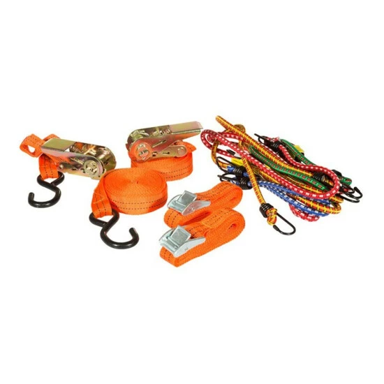 Dieses Sicherungsgurte-Sortiment ist ideal geeignet zum Befestigen und Sichern von Lasten. Set beinhaltet je 4x je 2 elastische Spanngurte mit einem Durchmesser von 8mm, Länge ca. 40, 60, 80, 100 mm. Einem 2-tlg. Zurrgurt mit S-Haken und Ratsche, 25 mm breit, 5 m lang. Je 2 Zurrgurte mit Klemmschloss, 25 mm breit, 2,5m lang und 1 Zurrgurt mit Ratsche, 25mm breit, 5m lang.