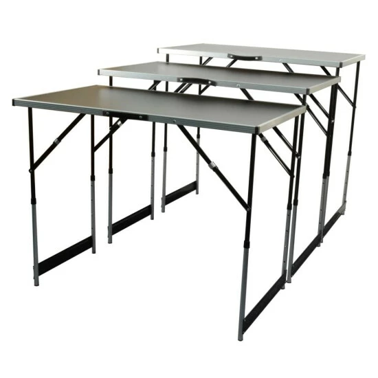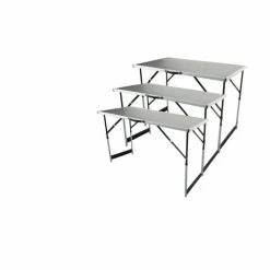 Brüder Mannesmann Multifunktionstische, 3-tlg. | M70113 | Hersteller-Nr.: M70113 | EAN: 4003315846994 | Produkttyp: Neu | Der Multifunktionstisch 3er Set aus dem Hause Brüder Mannesmann Werkzeuge sind vielseitig verwendbare Klapptische wie z. B als Tapeziertisch, Buffet-/ Partytisch oder Markttisch. Die Tischplatte besteht aus 2,7 mm starker MDF E1 Platte 60x 100 cm. Der Tischrahmen ist aus stabilem Aluminium gefertigt. Die Multifunktionstische sind einzeln sowie kombiniert verwendbar und sind 4-stufig höhenverstellbar. Die maximale Belastung liegt bei 30 kg pro Tisch. Durch das einklappbare Untergestell sowie praktische Tragegriffe wird platzsparende und komfortable Lagerung/ Transport ermöglicht. – Tischrahmen aus stabilem Aluminium – einzeln und kombiniert verwendbar – 4- stufig höhenverstellbar, 73 cm, 80 cm und 94 cm – max. Belastung 30 kg pro Tisch – einklappbares Untergestell, für platzsparende Lagerung – praktische Tragegriffe – Klapptisch verwendbar als Tapeziertisch, Buffet-/ Partytisch, oder Markttisch – Tischplatte aus 2,7 mm starker MDF E1 Platte 60×100 cm | Kategorie: Neu