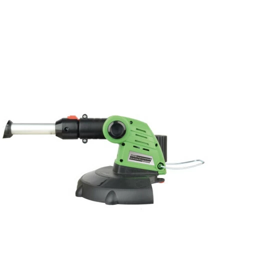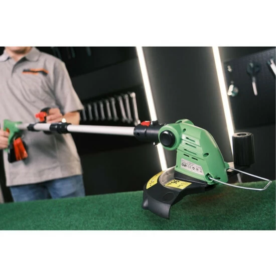 Der Schneidkopf kann um 90° nach links oder rechts gedreht werden und stellt dadurch sicher, dass mit einer geraden Haltung die Arbeit mit geringem Kraftaufwand erledigt wird. Der Griff ist verstellbar und der Rasentrimmer ist teleskopisch ausziehbar, so dass dieses Gartengerät an die individuelle Größe des Benutzers angepasst werden kann. Die variabel einstellbare Schutzhaube dient zum Schutz von Pflanzen und Sträuchern, und verhindert wirksam den Verschleiß des Kunststoffmesser.