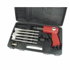 QUALITÄT VON MANNESMANN-WERZEUGE!! Druckluft-Meisselhammer mit 5-teiligem Meisselsatz. Mit Stecktülle für Druckluft-Schnellkupplung. Für Stemm- und Trennarbeiten universell einsetzbar. Schlagzahl 3000/min..Hub 19 mm. Betriebsdruck 6 – 7 bar, Luftverbrauch 160l/min. Inhalt: 1 Druckluft-Meisselhammer, 1 Blechtrennmeissel, 1 Universalmeissel, 1 Flachmeissel, 1 Stitzmeissel, 1 selbstführender Blechtrennmeissel. Alle Artikel übersichtlich im Aufbewahrungskoffer.