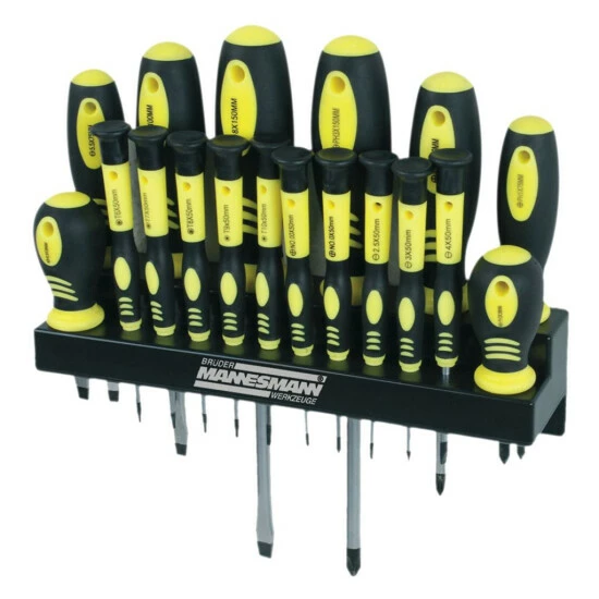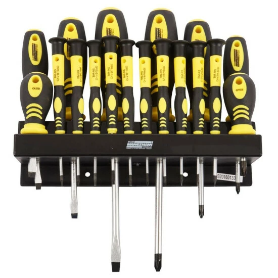 18-teiliger Schraubendrehersatz aus hochwertigem Chrom-Vanadium-Stahl von Mannesmann mit magnetischen Spitzen, inklusive Wandhalterung. Dieser 18-teiliger Schraubendrehersatz aus hochwertigem Chrom-Vanadium-Stahl von Mannesmann mit magnetischen Spitzen besteht aus:
