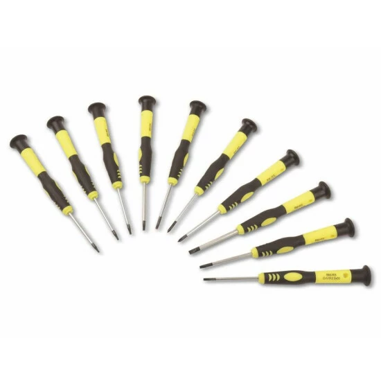 Der 18-teilige Schraubendrehersatzsetzt sich aus 8 Werkstatt-Schraubendrehern sowie 10 Feinmechaniker-Schraubendrehern und einem Wandhalter zur Aufnahme der Schraubendreher zusammen. Alle Werkzeuge besitzen Klingen aus Chrom-Vanadium-Stahl und haben Der 18-teilige Schraubendrehersatzsetzt sich aus 8 Werkstatt-Schraubendrehern sowie 10 Feinmechaniker-Schraubendrehern und einem Wandhalter zur Aufnahme der Schraubendreher zusammen. Alle Werkzeuge besitzen Klingen aus Chrom-Vanadium-Stahl und haben eine magnetische Spitze. Lieferumfang: 3 Feinmechaniker-Schlitzschraubendreher, SL2,5×50 mm, SL3x50 mm, SL4x50 mm 2 Feinmechaniker-Kreuzschraubendreher, PH0x50 mm, PH00x50 mm 5 Feinmechaniker-T-Profil-Schraubendreher, T6, T7, T8, T9, T10 4 Schlitzschraubendreher: SL6,5×38 mm, SL5,5×75 mm, SL6,5×100 mm, SL8x150 mm 4 Kreuzschraubendreher: PH2x38 mm, PH1x75 mm, PH2x100 mm, PH3x150 mm Wandhalter