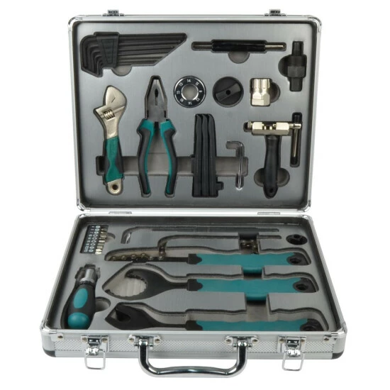 Dieses umfangreiche Fahrradwerkzeug-Set ist im praktischen Aluminiumkoffer mit Schaumstoffeinlage sicher aufbewahrt und lässt sich leicht transportieren. Der Fahrrad-Werkzeugkoffer besteht aus allen wesentlichen Werkzeugen für die Durchführung von Wartungsarbeiten an deinem Fahrrad zu Hause oder unterwegs.