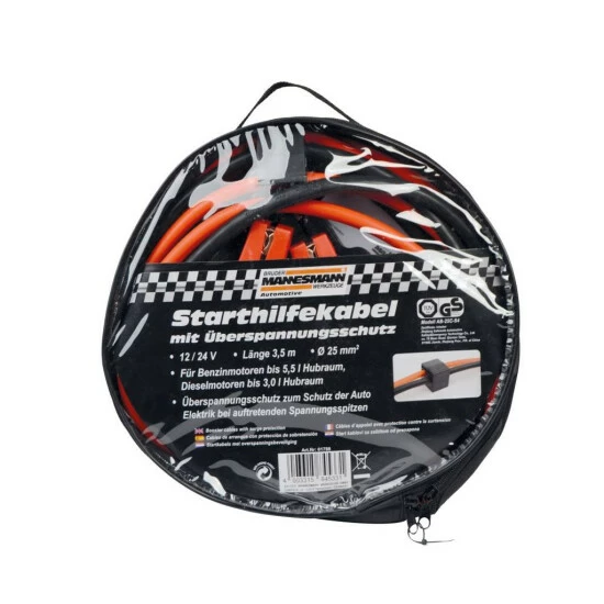 Brüder Mannesmann 3, 5 m Starthilfekabel 25 mm, in Rundtasche | M01788 | Hersteller-Nr.: M01788 | EAN: 4003315845331 | Produkttyp: KFZ-Sonderwerkzeuge | Das 3,5 m Starthilfekabel aus der Automotive Reihe aus dem Hause Brüder Mannesmann Werkzeuge ist die verlässliche Lösung bei einer schwachen Autobatterie. Das Kabel wird mit der einen Seite an einem Auto mit funktionierender Autobatterie angeschlossen und mit der anderen Seite an das zu startende Auto. Sehen Sie hierzu im jeweiligen Bordhandbuch der beiden PKWs nach, wo Sie die jeweiligen Befestigungspunkte an der Batterie finden. Das Starthilfekabel ist für Benzinmotoren bis 5,5 l Hubraum und Dieselmotoren bis 3,0 l Hubraum geeignet. | Kategorie: KFZ-Werkzeuge-Zubehoer > KFZ-Werkzeug > KFZ-Sonderwerkzeuge