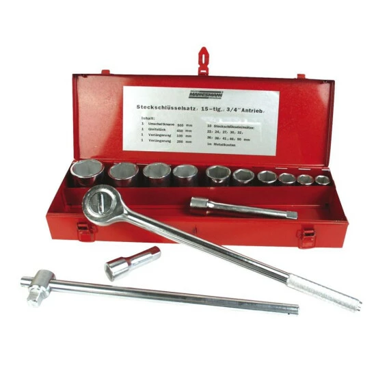 Brüder Mannesmann Steckschlüsselsatz 3/4 15-tlg. | M296 | Hersteller-Nr.: M296 | EAN: 4003315059134 | Produkttyp: Steckschluessel-Sets | – 3/4 – Aus Chrom – Vanadium Stahl gefertigt – In stabiler Blechkassette – verchromt | Kategorie: Handwerkzeuge > Steckschluessel > Steckschluessel-Sets