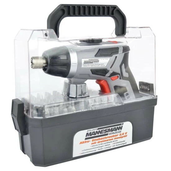 Mit einem Gehäuse aus Bi-Chrom und Kunststoff, sorgt dieser leistungsstarke 3,6-V-Akkuschrauber von Brüder Mannesmann für eine dauerhafte Befestigung verschiedenster Schrauben. Der leistungsstarke Schraubendreher wird mit einem 3,6 V 1300 mAh Li-Ionen-Akku betrieben (im Lieferumfang enthalten) und verfügt über einen praktischen Links-/Rechtslauf. 6 Drehmomenteinstellungen stehen Ihnen zur Verfügung. Der Schraubendreher verfügt auch über einen drehbaren Handgriff und eine leicht ablesbare Ladezustandsanzeige. Darüber hinaus ermöglicht der Lithium-Ionen-Akku ein schnelles Aufladen. Der Elektroschrauber und das Bit-Set (52 Bits) werden in einer Kunststoff-Kassette mit transparentem Deckel geliefert.